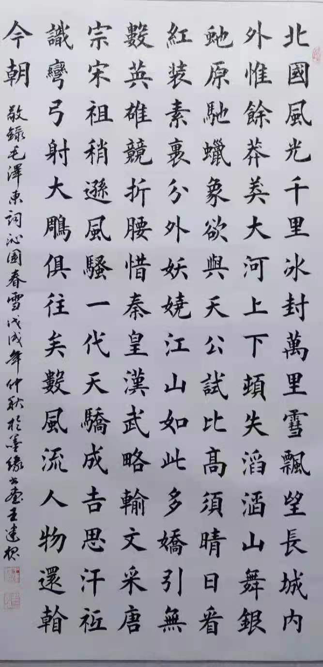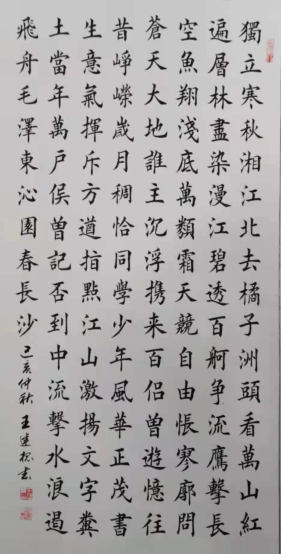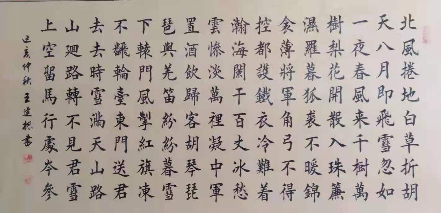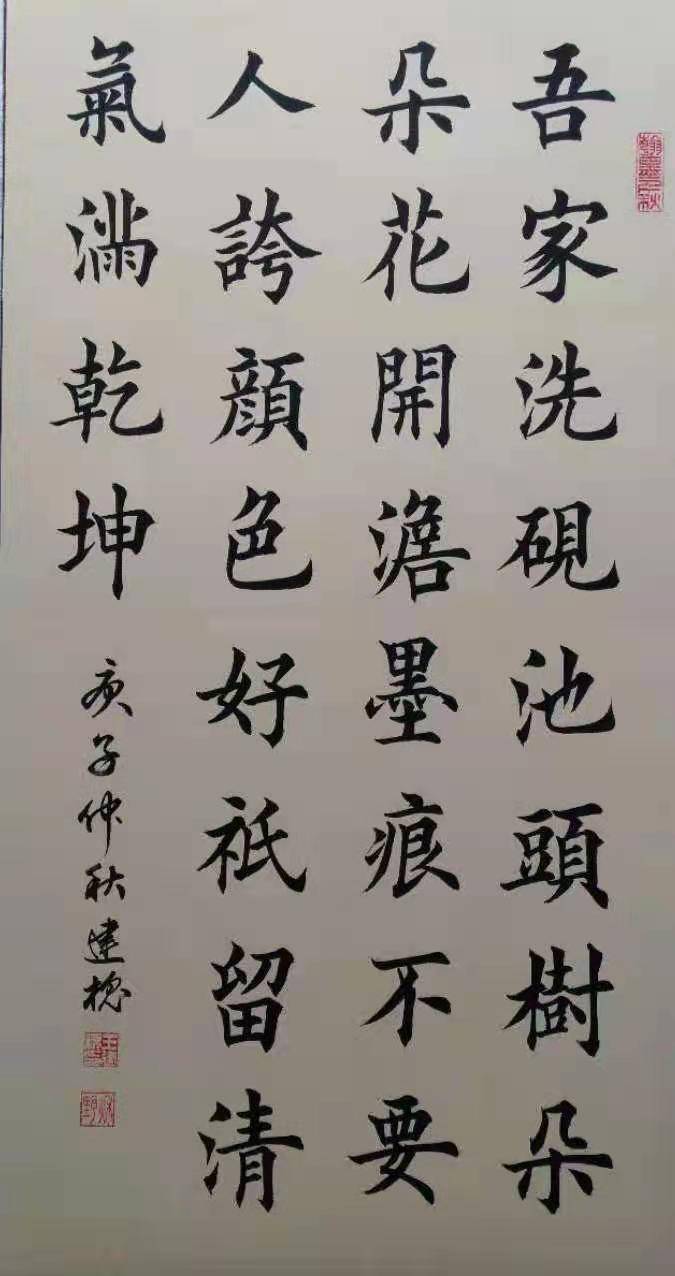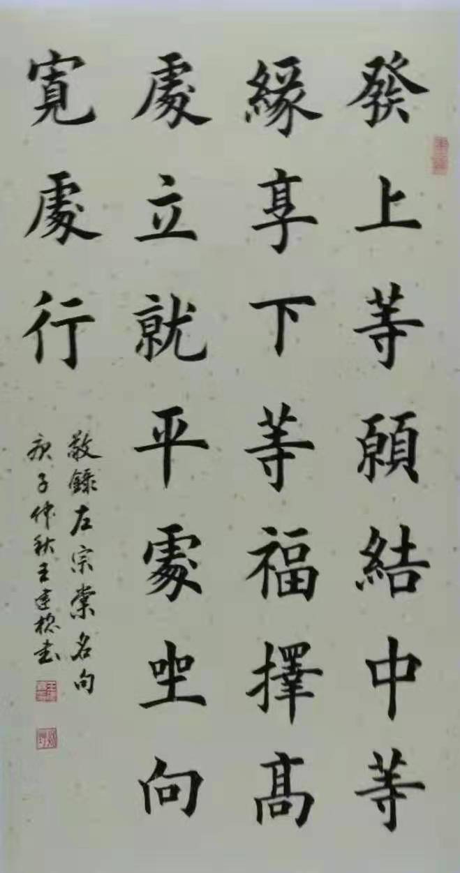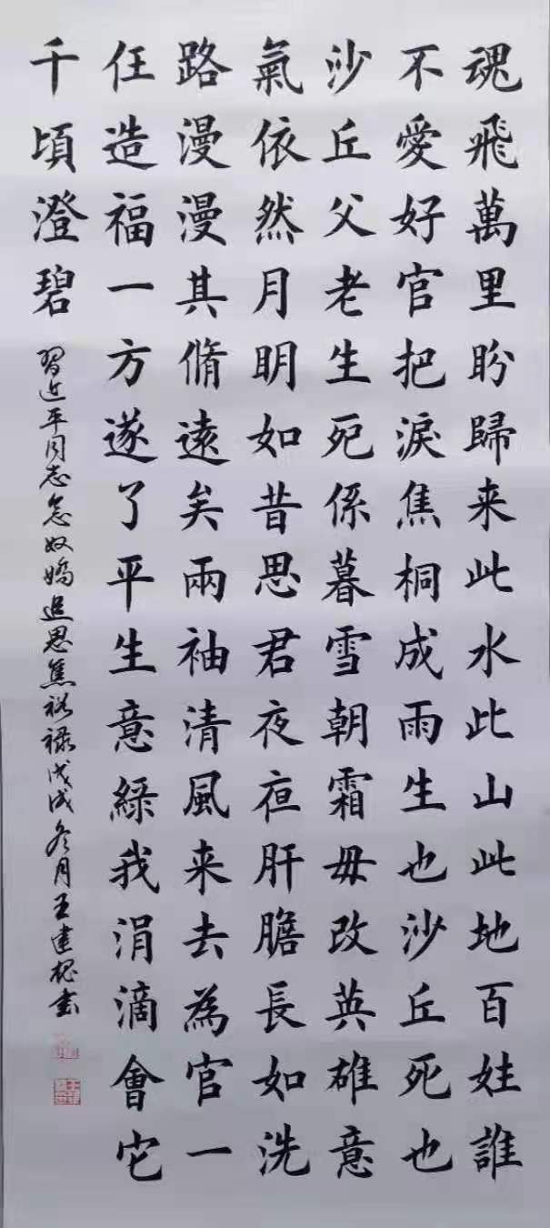 书法美是一种直觉美,鉴赏书法不需要理念,不需要想象,不需要技巧,我们一看,瞬间就能感觉到是美是丑。这种直觉,依凭的是潜意识,是潜意识中人类文化的沉淀、或人文素养的积淀,或人生阅历的积淀。潜意识是人人具有的,因此不论怎样的人,都会有一种对书法的“一词评价”,好或不好。特别是楷书,因大部分人都认识,也有前人名家作参考,所以一下就能让稍有书法基础的人判断美与丑。王建槐老师的的概书循欧楷之法,又融入了自已的元素,法度中彰显了他深厚的书法贴学基础。现实中楷、行、草都能兼修而达到境界的是不多的。