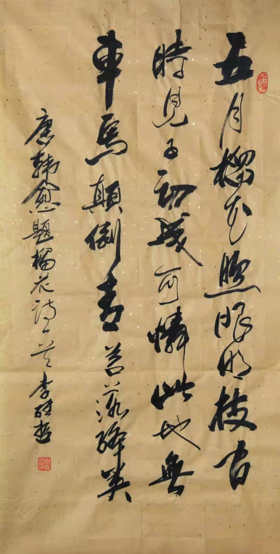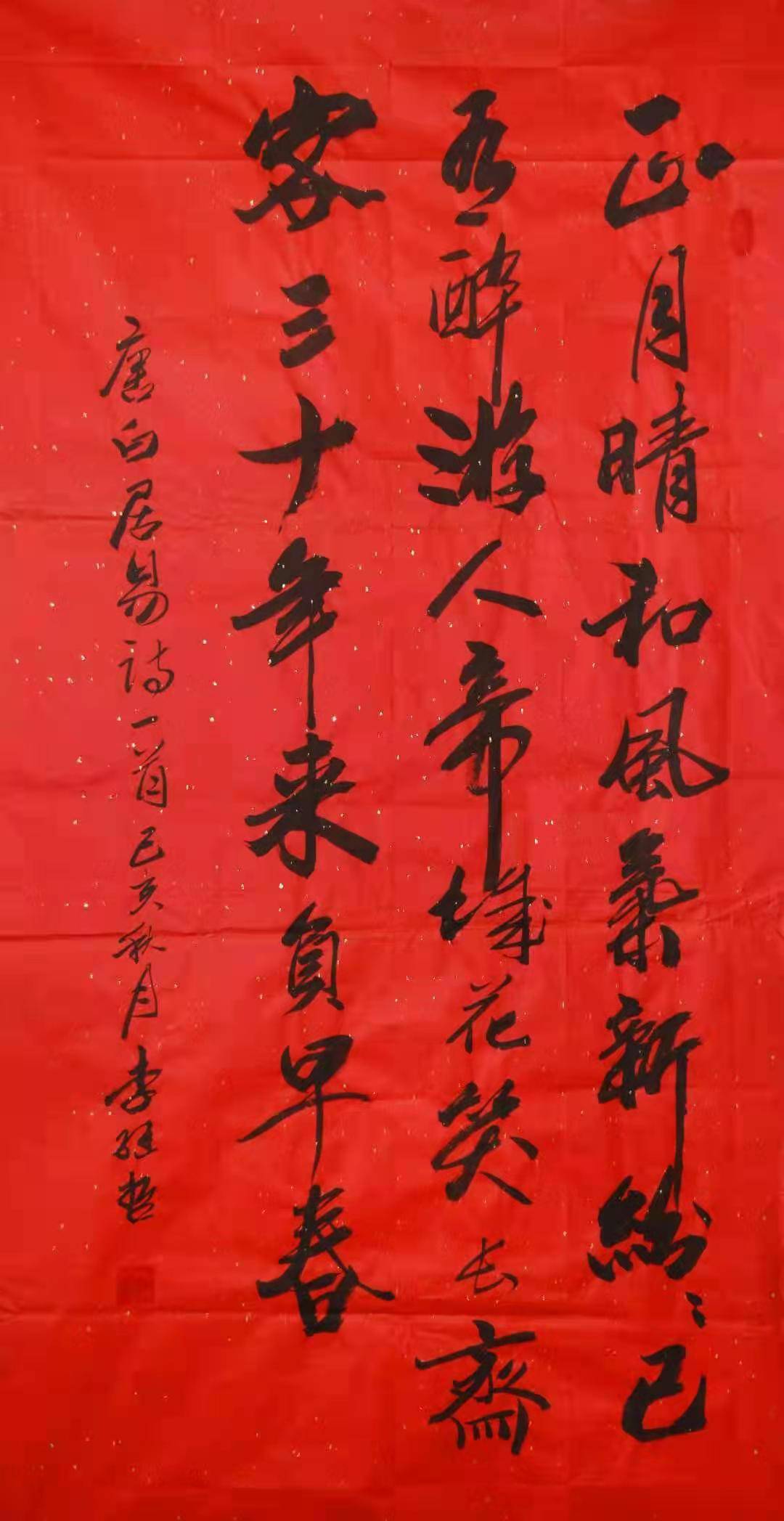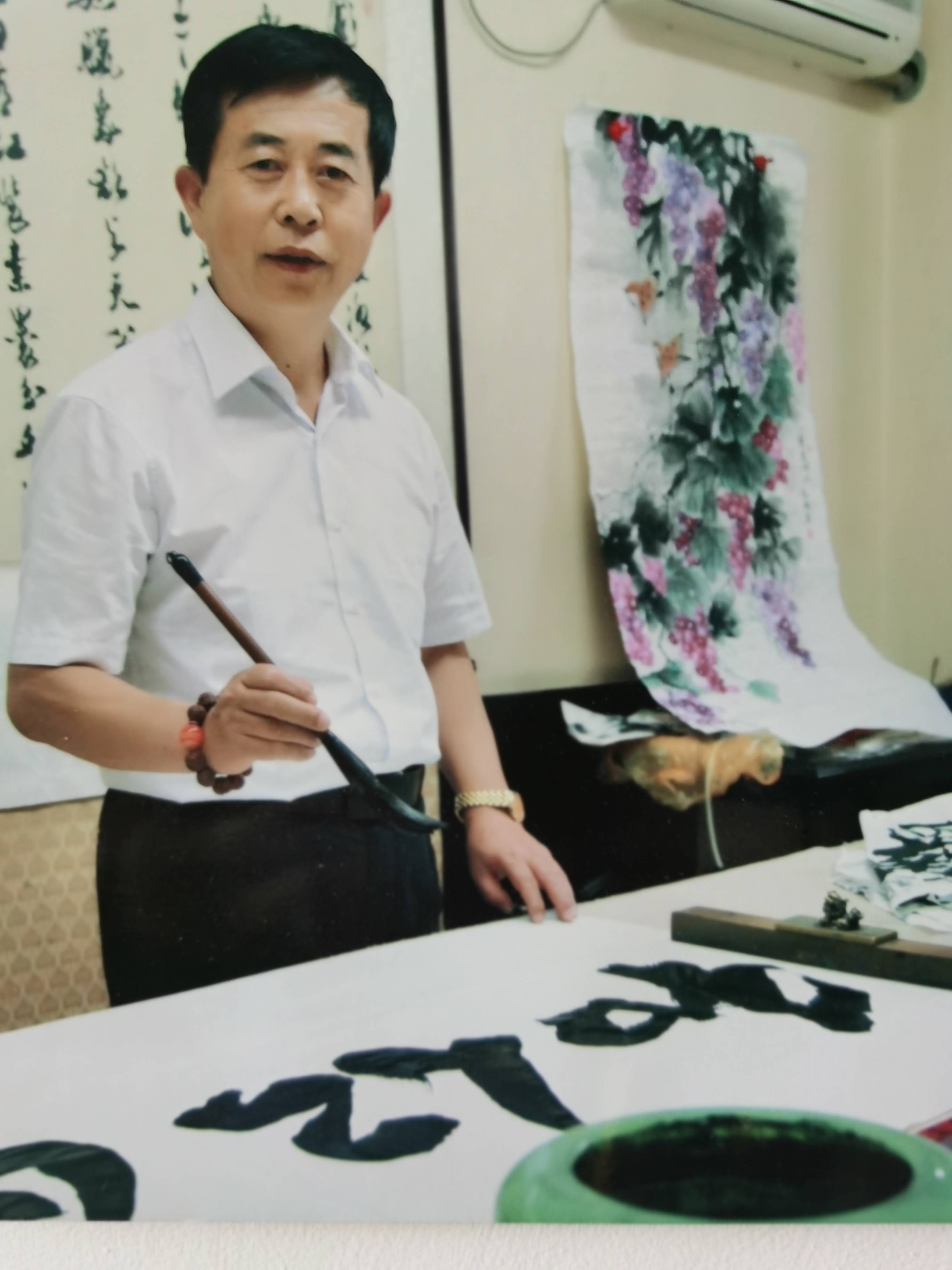 在交谈中,记者不失时机地请教关于书法文化的一些知识,李继哲老师毫不保留地讲了一些作品创作中忌讳的东西,他说:“一幅作品忌平、散、挤、弱。平则无起伏变化;散则气势全断;挤则全篇无重点,嘈杂纷乱,不堪入目;弱则全篇无精打采。 另外首行不正:作品首行之首字与尾字,要在同样的位置,否则整行歪斜矣”。 听了李老师的一翻入木三分的高论,可谓受益匪浅,笔者对书法艺术的认识又更上了一层楼了。