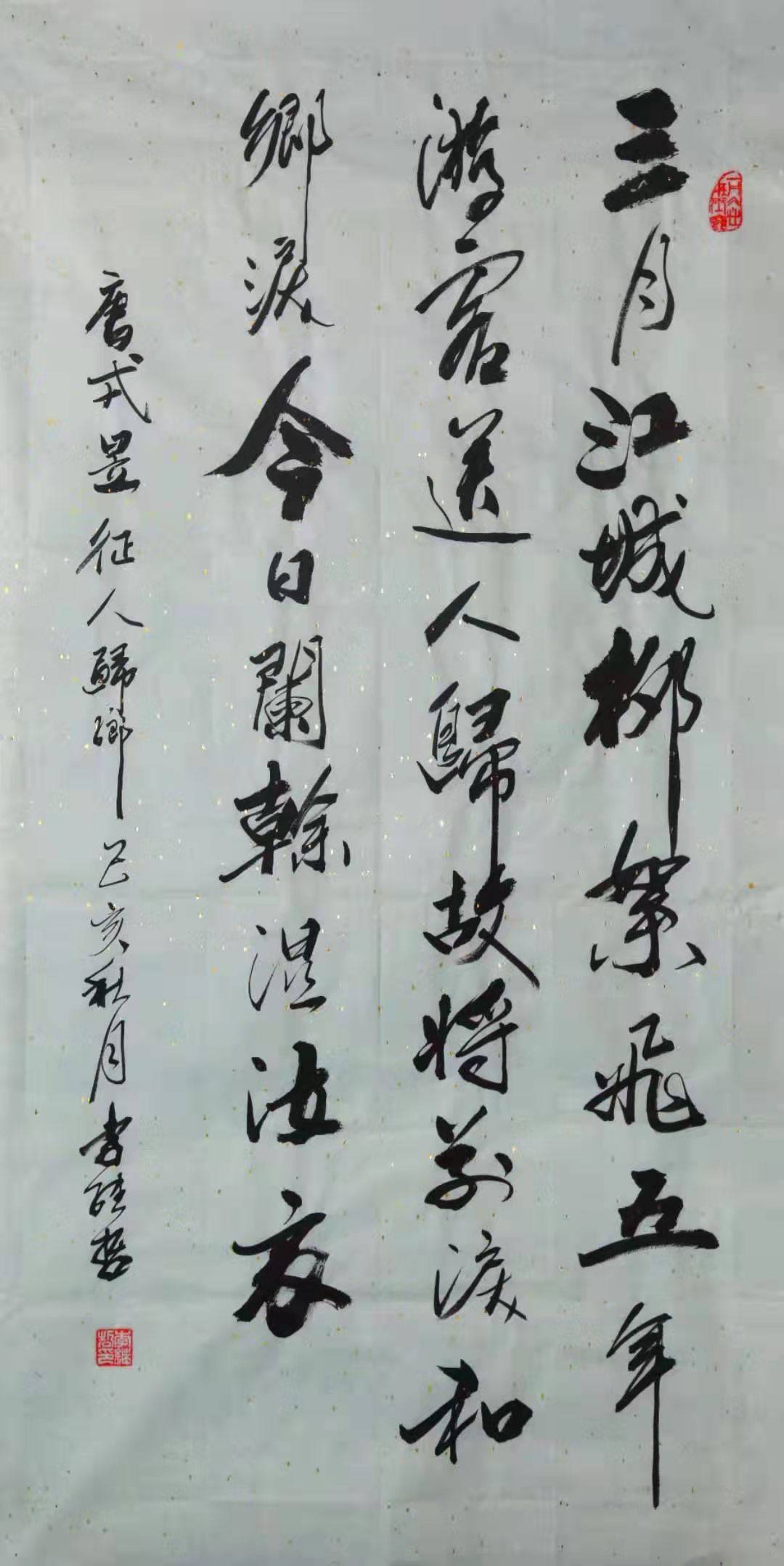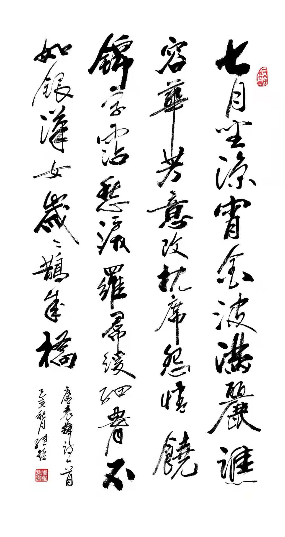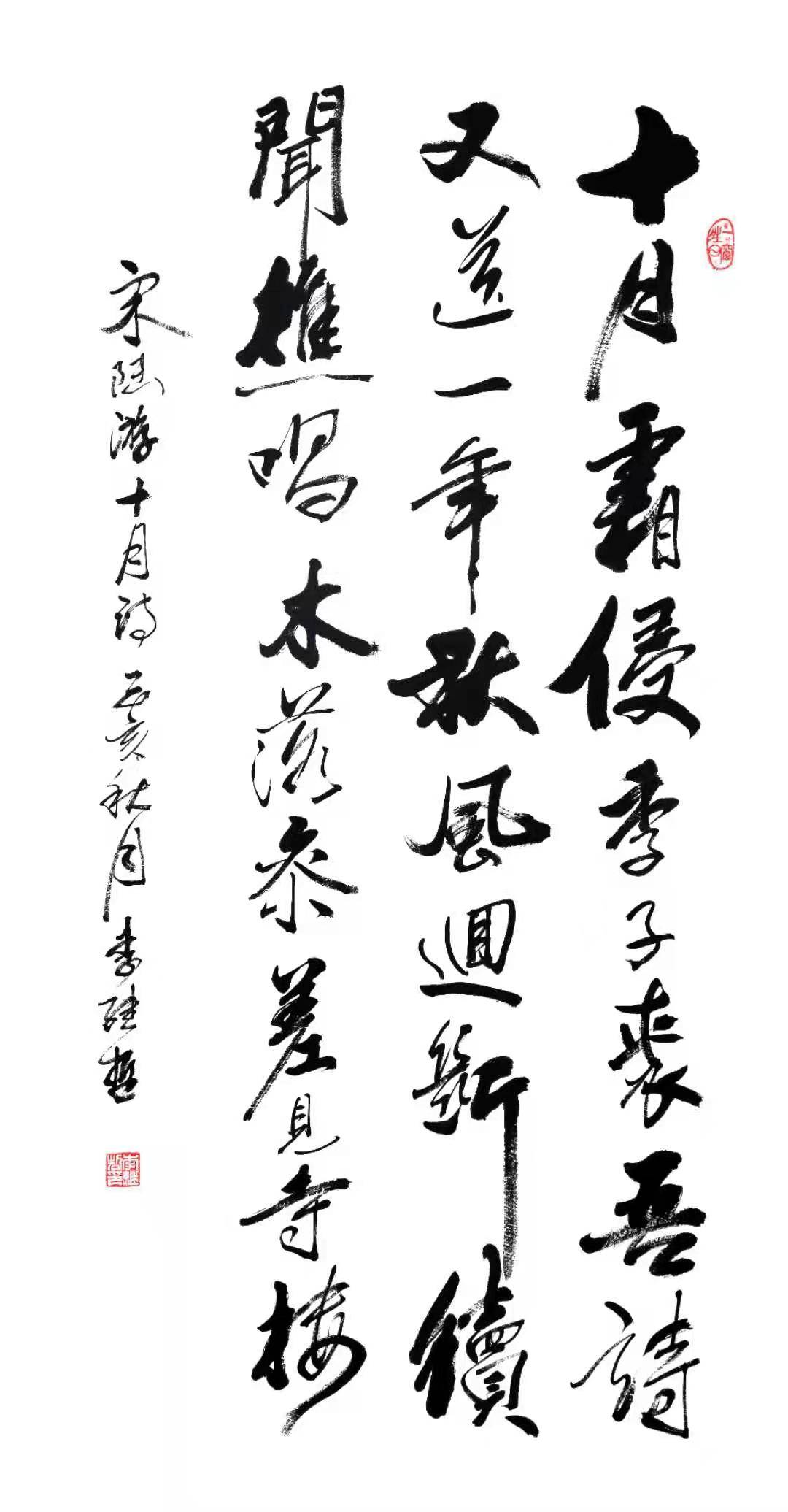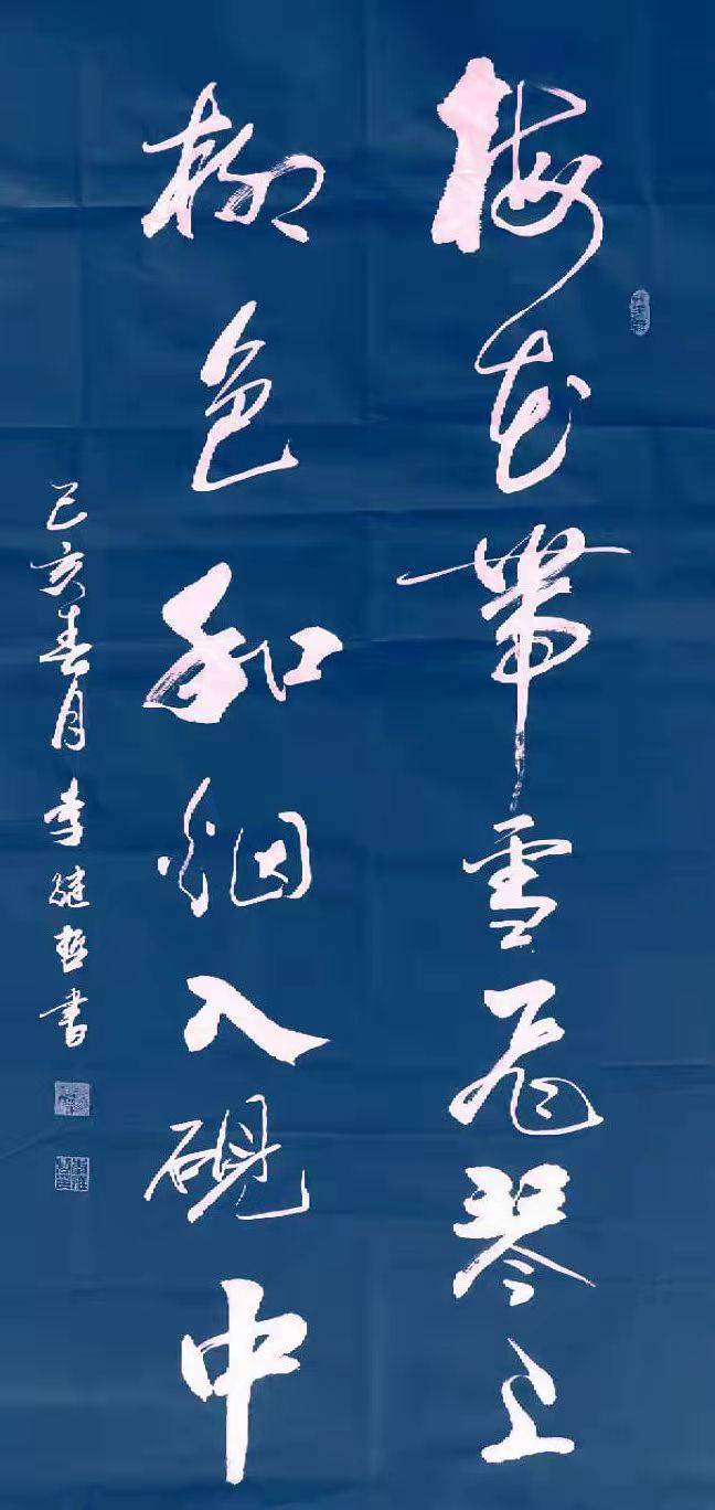 从李继哲老师的作品中我们不难看出,他是以行草而见长书坛的。书法艺术尚势而立,蔡邕在《九势》中言:“夫书肇于自然,自然既立,阴阳生焉,阴阳既生,形势出矣。”蔡邕首次对书法势的阐述,使之后的书家在创作时更加注重对势的把握。小行草虽点画简省损益,且连绵萦带较少,变化不大,所以在“势”地处理上书家往往容易忽略,要想在“简”、“省”之余造势,具有很大的难度。行草书难在造势,而后能立!对势的把握和驾驭,是写好行草书的关键。李继哲老师在行草书的一大特点上;书写架构在对“势”的把握和统领上是很注重的,从他作品创作中我们不难看出,他很讲究落笔收笔及运笔的取势,也只有这样创作出来的作品,才能给观赏者视觉冲击上的美感,当然这一切这必须得益于几十年的笔耕不辍,苦心研修才能做到,所谓冰冻三尺,非一日之寒呀。
