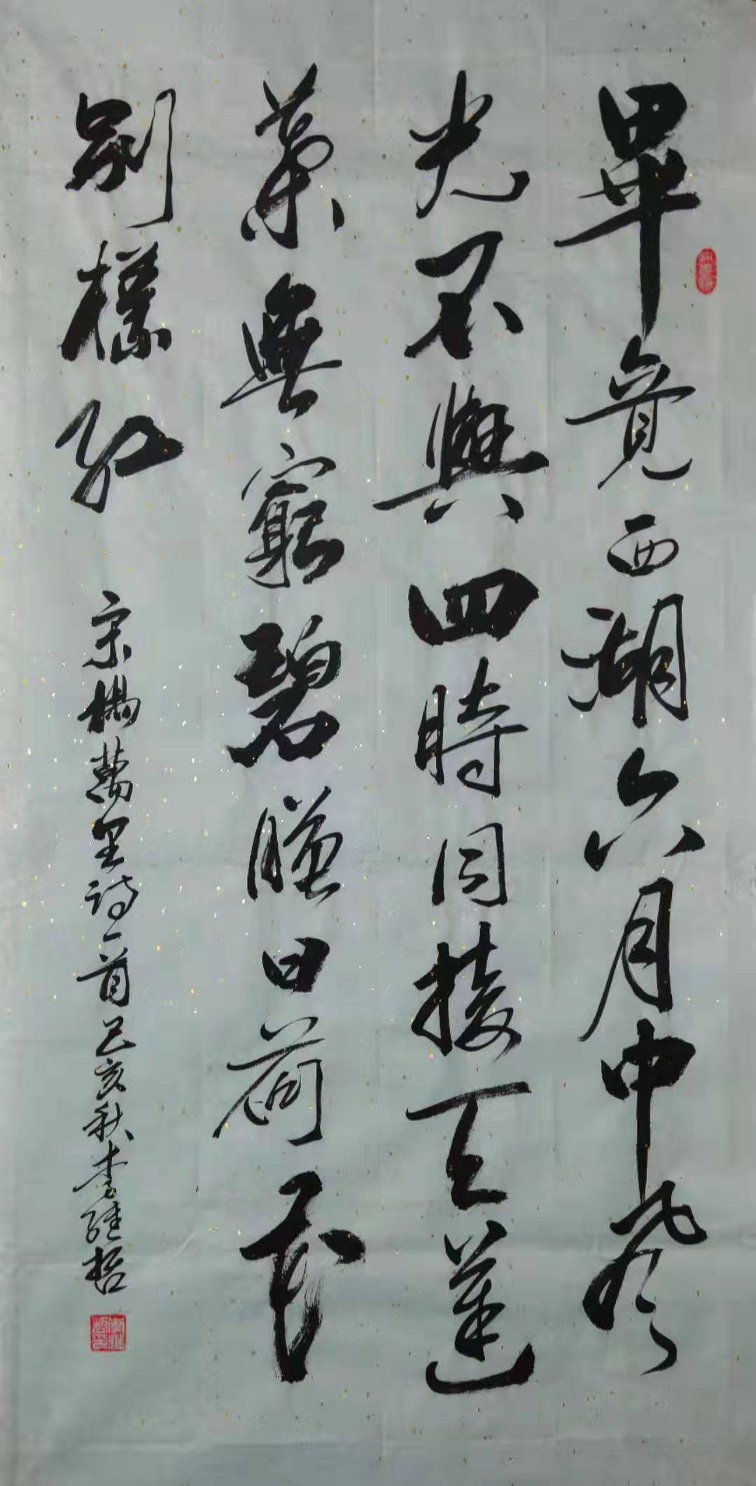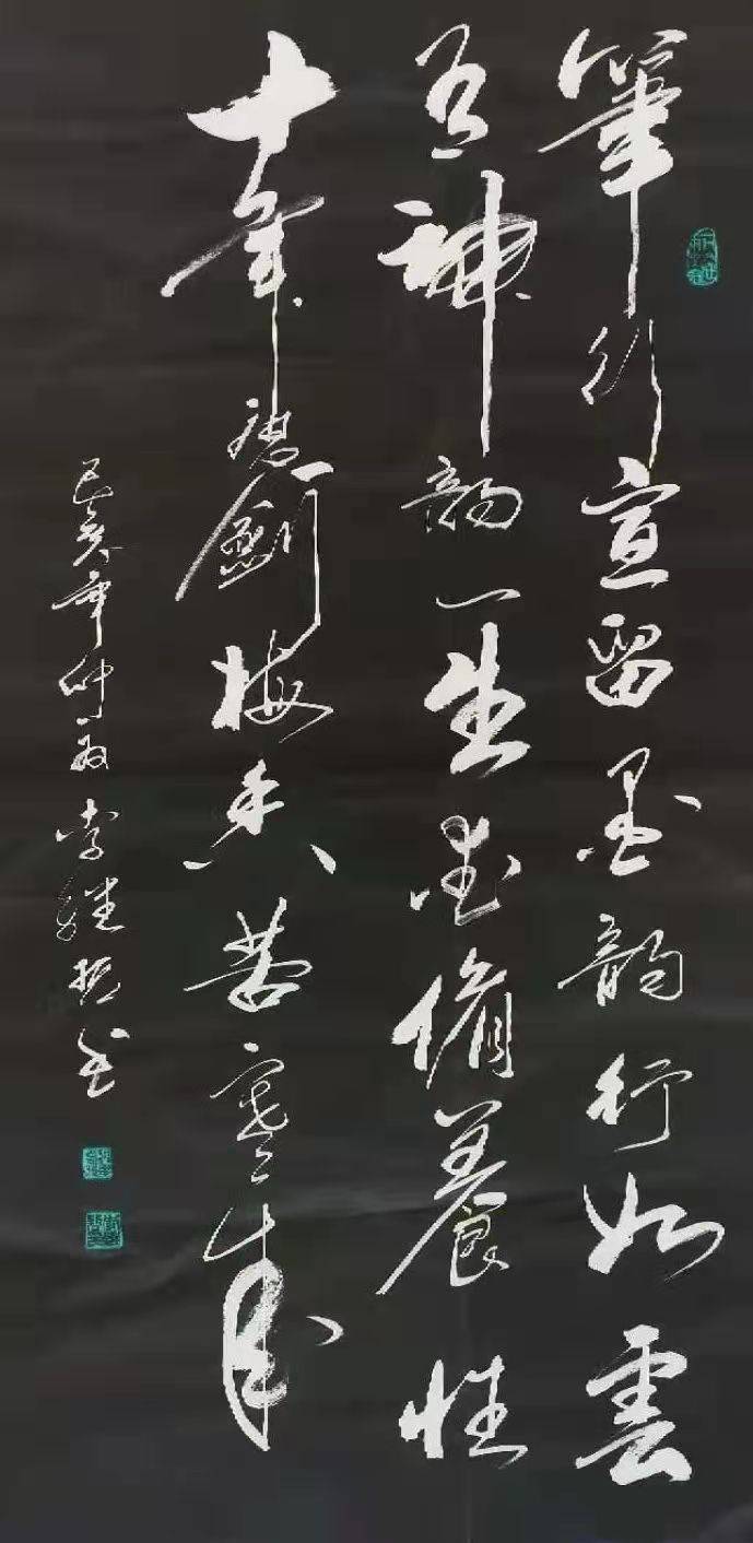 没有文化底蕴的书家,在书法造诣上是绝对不会有所创新、有所成就。李继哲老师说,有很多书家在创作作品,特别是大庭广众下临场发挥,往往会怯场,而作品写出来和平常相差甚远,这就是平时对作品的构思、谋划没做到位,他强调所书内容、意境、结字、连断、下墨、留白、画眼均要熟记于心,方书随心动,笔由心发。不熟者, 则是处处断开而气息不通。他说从字面直观上讲,一幅好作品应字字相连,错落有致,用笔、用墨、大小有机结合且又互相揖让,阴阳分明,方可称书者中变化高手,可惜一般书家难以达到这般境界。